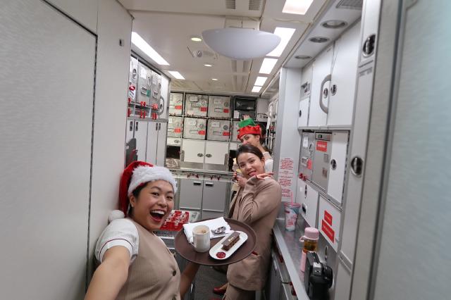クリスマスフライトなので、CAさん達もサンタ衣装でノリノリ!!
